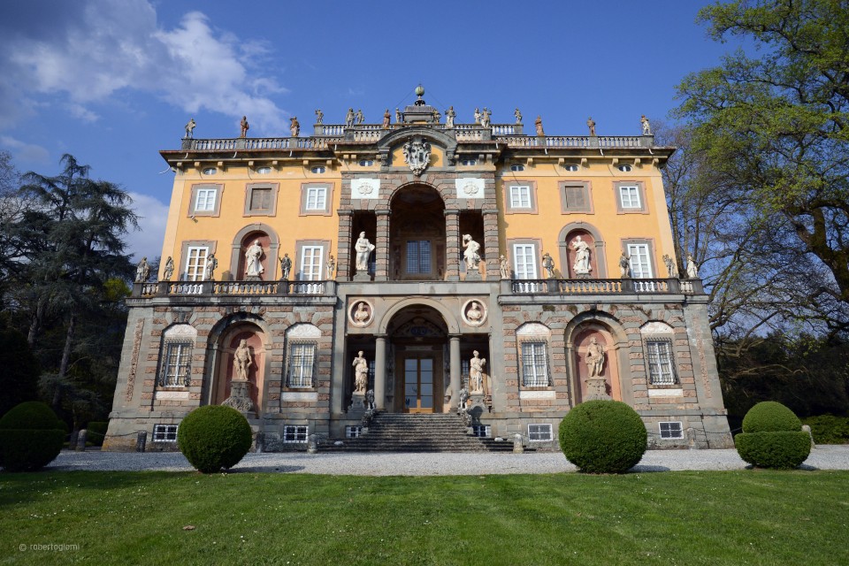 La Villa rinascimentale con il giardino “ad orto”, costruita per i Marchesi Buonvisi, fu trasformata nell'attuale sontuoso Palazzo con il Giardino - Teatro di Flora dal Marchese Nicolao Santini, ambasciatore della Repubblica di Lucca alla corte del Re Sole (Louis XIV). Acquistata nel 1636, decise di farne “la Sua Vesailles” consigliato da Andrée Lenotre per le grandi fontane e costruendo il “Borgo Parigi”.  La teatrale facciata ornata di statue annuncia la ricchezza dello stile interno, con affreschi (di P. Scorzini e V. Dandini), collezioni ed arredi ancora originali, essendo gli attuali proprietari discendenti diretti del Marchese Santini. Un imponente viale di cipressi esalta l'arrivo e nel Parco antiche Camelie e rare specie botaniche, inserite da Vittoria Santini Torrigiani (XIX°), hanno raggiunto notevoli dimensioni dando al giardino un aspetto più Romantico.  Luogo di cultura ed incontri, ha ospitato tra gli altri i Presidenti francesi George Pompidu e Giscard d'Estaing, la Regina Madre d'Inghilterra Elisabetta I, che ha piantato un albero, il Primo Ministro canadese Jean Chrétien, in visita privata durante il G8 a Genova. Nel teatrino cantò Maria Malibran e più recentemente Cecilia Bartoli, in visita privata.  La Villa fu aperta alle visite dalla Principessa Simonetta Colonna di Stigliano, nata Marchesa Torrigiani, pur continuando ad essere abitata dalla famiglia.