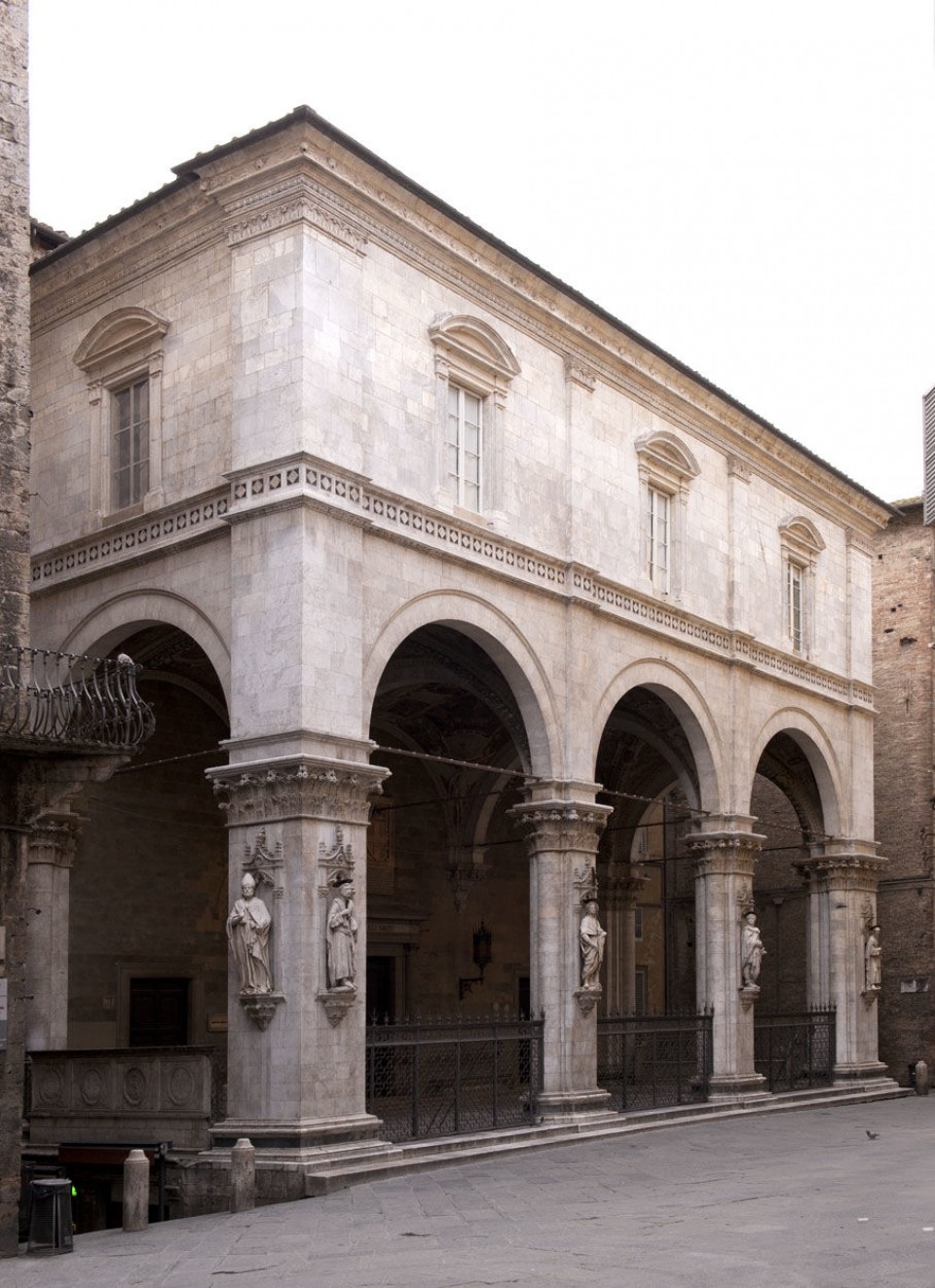 La Loggia della Mercanzia è uno dei più importanti monumenti del Rinascimento Senese. Edificata nella prima metà del XV secolo come ricco ampliamento dell’ingresso al Tribunale della Mercanzia, essa si compone di cinque arcate sostenute da quattro pilastri marmorei finemente decorati. Sul lato esterno degli stessi pilastri si trovano cinque statue di marmo collocate in apposite nicchie. All’inizio dei rispettivi vicoli, frontalmente, vediamo San Pietro e San Paolo, scolpite da Lorenzo di Pietro detto il Vecchietta. Inoltre si possono ammirare tre Santi protettori della Città di Siena: San Savino (laterale), San Vittore e Sant'Ansano (frontali), opere di Antonio Federighi. Le opere risalgono agli anni 1459-1462 circa. La Loggia è delimitata lateralmente da due pancali marmorei. Quello di sinistra, opera di Urbano da Cortona, rappresenta le Virtù cardinali; quello di destra, ancora una volta di Antonio Federighi, rappresenta alcuni personaggi della storia romana. Entrambe le panche risalgono allo stesso periodo delle statue. Il soffitto a volte, decorato di stucchi e di pitture ad affresco, è stato molto restaurato nel XIX secolo secondo i criteri dell’epoca ed ha perso molto delle caratteristiche originarie. Oggi tutto il complesso dell’antico Tribunale della Mercanzia, composto dal Palazzo e dalla Loggia, appartiene al Circolo degli Uniti, un’associazione la cui fondazione risale al 1657. Alla metà del Settecento, quando la proprietà passò agli Uniti, il Palazzo della Mercanzia, la cui facciata si apre su Piazza del Campo, fu completamente ristrutturato nelle forme che vediamo oggi e per il progetto offrirono disegni gli illustri architetti Luigi Vanvitelli e Ferdinando Fuga.