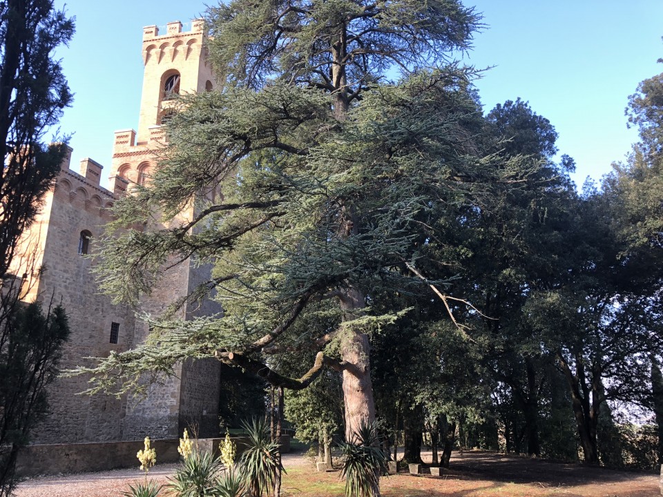 Il castello Villa Torre ritrova le sue origini ancor prima dell’anno mille, alla fine del IX sec, come si evince dai documenti che attestano l’arrivo nella zona della famiglia Guinigi (Wuiinigi) che volle costruire diversi presidi fortilizi di avvistamento sulle colline circostanti la pianura di Buonconvento e in prossimità del fiume Ombrone, altresì il basamento scarpato, interno al fossato, richiama tali origini. Nel corso dei secoli il castello è stato residenza delle famiglie più importanti del panorama storico toscano e non solo. Durante il Rinascimento fu teatro delle intricate vicende della famiglia Petrucci e soprattutto del cardinale Raffaello. Nipote di Aurelia Borghesi (Borghese) e del magnifico Pandolfo Petrucci, il giovane cardinale era conosciuto come personaggio oscuro e scaltro, nonché abile politico; ebbe qui la sua dimora, luogo ameno per i suoi sollazzi, quando, in sintonia con papa Leone X e in disaccordo con il resto della sua casata più vicina ai della Rovere, si fece sostenitore della famiglia dei Medici. Rientrato a Siena nel 1517, con pieni poteri conferitigli dal papa, Raffaello però“ebbe poco a godersi sua villa”, morì il 17 dicembre del 1522. Tra gli interventi di ristrutturazione più importanti di questo periodo vi fu la realizzazione del maestoso portone d’ingresso, che venne spostato, per inserire una cappella all’interno della fortificazione; sul lato nord delle mura perimetrali si vede ancora oggi l’arco a sesto acuto tamponato, di epoca medioevale, che consentiva l’accesso attraverso un ponte levatoio. Il cardinale lasciò in eredità questa residenza al nipote Fabio Petrucci, il quale, sposando una Medici, Caterina figlia di Galeotto, diede seguito agli auspici dello zio cardinale. Lo stemma, apposto sopra il “nuovo” portone d’ingresso, testimonia questa unione tra le famiglie. Negli anni a seguire, la storia della proprietà vide altre famiglie note, tra cui i Chigi, con documenti presenti all’Archivio di Stato di Siena, poco dettagliati però circa lasciti e relative donazioni. Dalla fine del XVII secolo, compare nei documenti catastali, la famiglia Marri Mignanelli. Intorno al 1850, sarà questa la committente di un’imponente ristrutturazione ad opera dell’architetto Giuseppe Partini che eseguirà il lavoro prediligendo lo stile neo gotico tanto in voga in quel periodo. L’architetto modificò i piani e la scala dell’ala gentilizia, impreziosendo gli ambienti con pregevoli affreschi. Inoltre, anche innalzando la torre campanaria con l’orologio, sembrò proprio voler creare una colleganza stilistica con la vicina città di Siena, a ricordare la facciata di Palazzo Salimbeni (sempre da lui rinnovata nei medesimi anni) e la più emblematica Torre del Mangia. L’Unione, giornale della Provincia di Siena, in data 14 novembre 1886, celebrò“la rinascita di un’impresa” menzionando l’avvenuta inaugurazione del 7 novembre ove, con grande entusiasmo, per la generosa iniziativa della Sig.ra Settimia Marri Mignanelli, si voleva “solennizzare” la fine dei lavori. Con i Marri Mignanelli e con i loro eredi, si giungerà poi alla seconda metà del XX secolo, quando l’intera tenuta verrà acquistata, nel 1986, dalla famiglia Parenti, attuale proprietaria. Il castello è stato sottoposto a vincolo monumentale nel 1994. Recentemente è stato eseguito un importante intervento di consolidamento per la sua conservazione e valorizzazione.