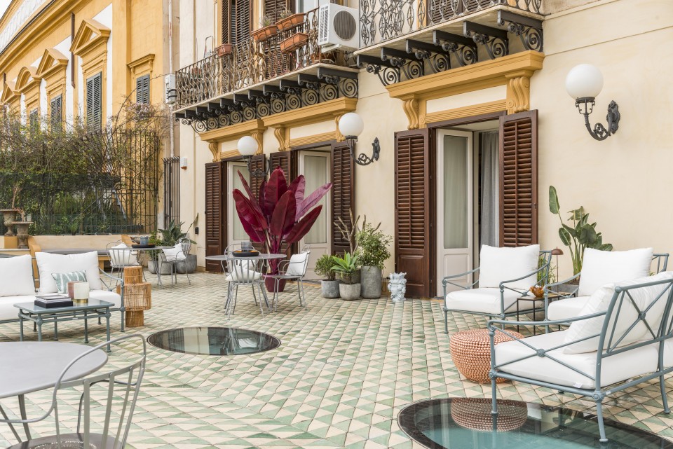 Il primo complesso costruito appositamente e con destinazione d'uso d'albergo fu proprio quello "della Trinacria". In quel posto avrebbe dovuto costituirsi un teatro privato ad uso della principesca famiglia, ma si ritenne più opportuno innalzarvi un nuovo edificio da adibire ad albergo.