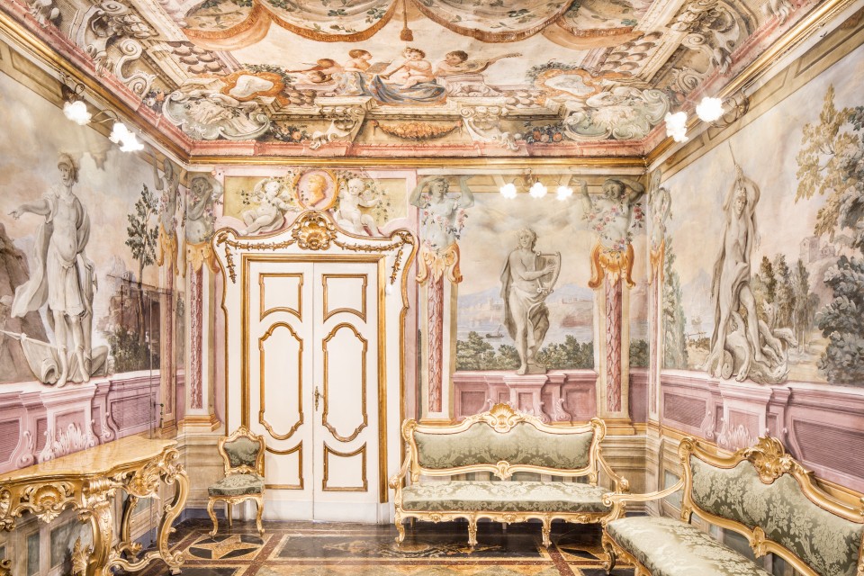 Altre sale si ispirano invece allo stile pompeiano in gran voga all’epoca del ritrovamento di reperti archeologici che venivano alla luce negli scavi di Ercolano e Pompei.