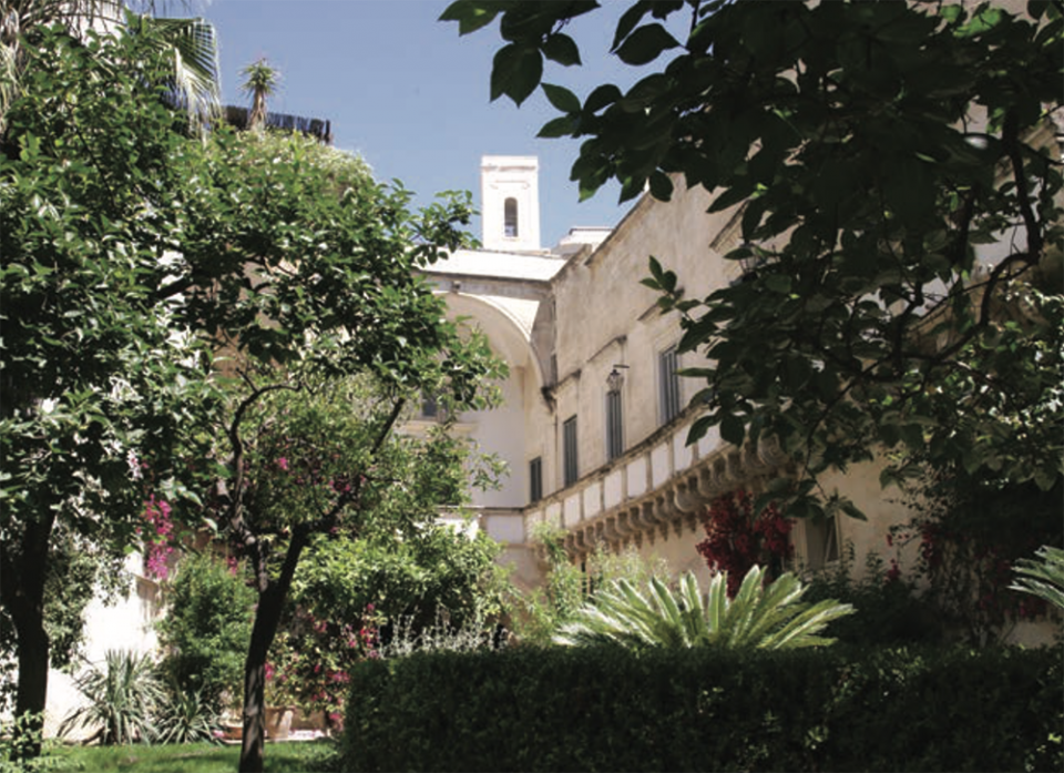 Edificato su una precedente struttura del XVI secolo, di cui si riconoscono alcune tracce (l'antico mignano che corre lungo tutta la facciata interna), il palazzo, la cui facciata risale al settecento su probabile progetto di Emanuele Manieri, appartiene sin da allora alla stessa famiglia, illustre casata di giureconsulti proveniente dalla Basilicata. Fa da sfondo un ridente giardino di piante mediterranee.