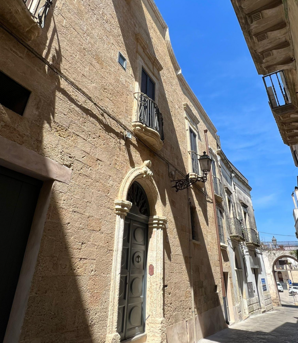Di fine Seicento, con rifacimenti settecenteschi, il palazzo si presenta con la sobria facciata, dove sporgono dei balconcini mistilinei, mentre una grande loggia con cornice bugnata si apre di fronte alla chiesa matrice. In alto al centro un arco passante sulla strada lo collega con l’edificio di fronte. Un portale centinato con volute in chiave introduce nell’androne dove vi è una bella scalinata settecentesca con colonnine tornite che conduce al piano nobile.
