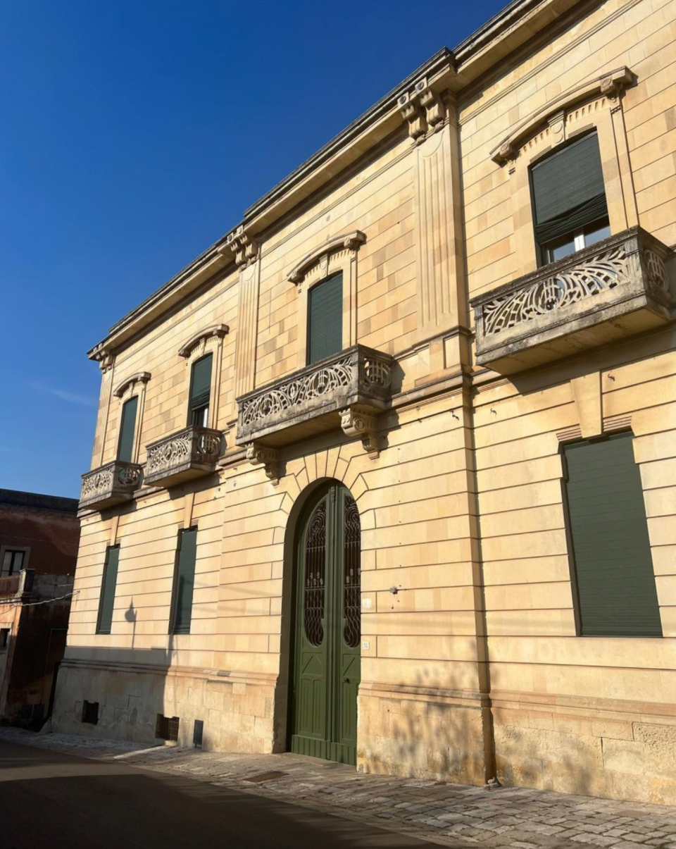 Di gusto liberty, è tra i più prestigiosi e imponenti palazzi costruiti agli inizi del Novecento. Sulla facciata principale, realizzata in pietra leccese, spiccano al primo piano dei bellissimi balconi in pietra traforata. Superato l’atrio quadrangolare si giunge ad un grande giardino.