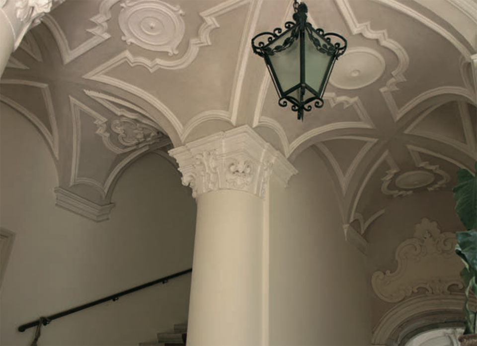 La severa linea della facciata su via Palmieri fa da controcanto alla facciata barocca sulla piazzetta Falconieri. Entrando dall’imponente portale durazzesco-catalano si accede all’androne, che porta nel cortile dove è possibile vedere subito le finestre a pera e, sulla destra, l’accesso ad una scenografica scala settecentesca. Ma voltandosi ecco che gli archetti pensili tardo cinquecenteschi riportano alle origini del palazzo.