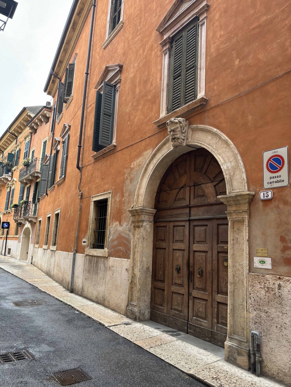 Il Palazzo risalente al XIV secolo è appartenuto fino alla metà del 1700 alla antica famiglia dei conti Sagramoso, ramo della pigna (da cui discendeva il più famoso Michele Enrico Sagramoso Balì del Sovrano Militare Ordine di Malta) e proprietaria dell'intero isolato. Il ramo dei Sagramoso della Pigna è poi confluito in quello di San Fermo e Sant'Andrea. L'edificio presenta per raggiunge il piano nobile uno scalone realizzato nel XIX secolo e, all'esterno la scala esterna a vista, tipica del medioevo veronese, nascosta da una tramezza. Nella corte sono presenti e visibili gli archi medievali con stemma araldico della famiglia Sagramoso e decori del secoli 18mo e 19mo ed un pozzo di origine stimata del XV secolo. Al piano nobile si nota la pavimentazione originaria del XIV secolo in cotto colorato ed un camino in marmo rosso. I soffitti presentano ancora le metope e i disegni del XIV secolo. Il palazzo fu acquistato intorno ai primi del XIX secolo da Luigi Messedaglia, notaio in Verona e padre di Angelo Messedaglia, Senatore del Regno nella XV legislatura, sostenitore della Destra storica, nelle cui file sedette in Parlamento come Deputato fra il 1866 e il 1882. Membro di varie Accademie italiane e straniere, ricoprì la carica di Presidente dell'Accademia dei Lincei fino al giorno della morte. A lui è dedicato l'omonimo Liceo Scientifico di Verona.