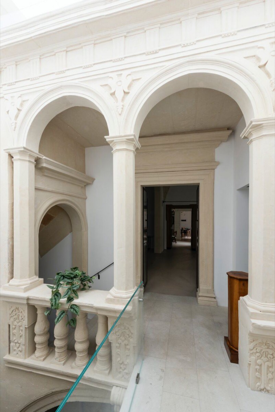 Il palazzo, di matrice cinquecentesca, è stato rielaborato nel tardo seicento per mano di Giuseppe Zimbalo, al quale è dovuta la loggia con archi decorati retti da snelle colonnine. Sull’arco di accesso alla scala che conduce al piano nobile si evidenzia lo stemma della famiglia Palmieri, del ramo proveniente da Cava dei Tirreni.