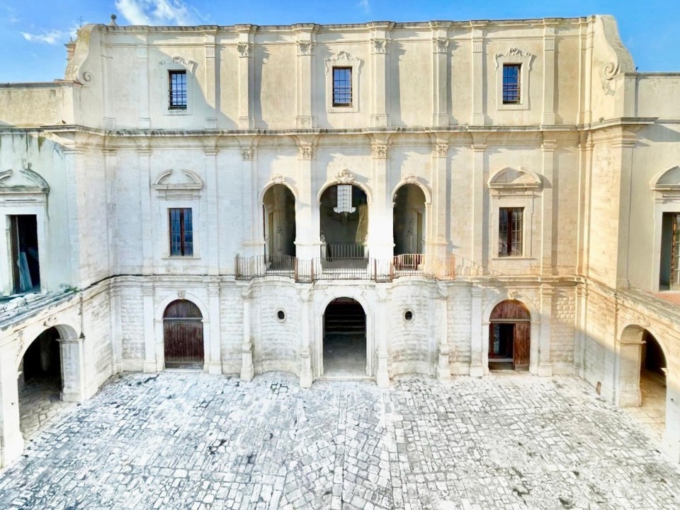 Il palazzo baronale sorse nel 700 inglobando una precedente struttura realizzata intorno al 1200 e una masseria cinquecentesca. Si tratta di un palazzo protetto da un imponente muro di cinta realizzato in conci di pietra a punta di diamante. Un maestoso portale (il cartiglio reca la data di ultimazione della costruzione1773) introduce all’ampio cortile d’onore sul quale prospetta la facciata barocca del palazzo. Ai lati dell’atrio d’accesso si aprono due porticati: in quello di sinistra sono ubicati i locali per la rimessa delle carrozze; in quello di destra le scuderie con le mangiatoie di pietra. Al piano nobile si accede attraverso una monumentale scalinata a ventaglio, a doppia rampa che corre sotto l’alta volta a vela, dal pianerottolo al primo piano si accede alla loggia balconata. Il giardino, l’altra meraviglia di questa residenza. Da un terrazzino dell’appartamento monumentale si accede al giardino pensile dove ci sono due bellissimi alberi, un cipresso macrocarpa e una tuia, alti 25 m nati con la casa. Da questo punto si scende una scaletta e ci si trova nella parte bassa del giardino dove due ampi cedri del Libano dominano la scena. (Tratto da Palazzi di Puglia)