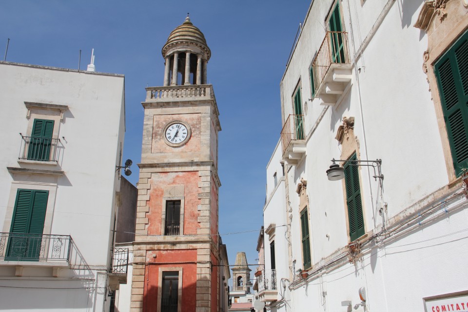 La Torre Civica, detta anche "dell'orologio", è il simbolo dell'identità civica della città delle gnostre (Noci). Progettata nel 1822 dall'architetto Orazio Lerario e costruita grazie al ricavato della vendita delle ghiande dei boschi demaniali, la Torre civica oggi si erge maestosa in Piazza Plebiscito (nel cuore del borgo antico) dinnanzi alla Collegiata della Natività di Santa Maria. L'edificio, alto circa trenta metri e a pianta quadrata, è diviso in quattro registri: l’ultimo costituito da una balconata e da una cupola in pietra, anziché in legno (questo per volontà dell'ing. Parenti che nel 1825 ridisegnò il progetto). Nel marzo del 1900, il maltempo causò la caduta delle colonne della cupola. Nello stesso anno, su progettazione degli ingegneri Enrico Palermo e Giovanni Galeone, si provvedette alla costruzione di quella nuova che ancora domina l'intero centro antico del paese. In questo tempietto, di gusto neoclassico, sono collocate due campane che fino a qualche anno fa accompagnavano i rintocchi delle ore. Sin dalla sua origine questo monumento ha avuto la funzione di scandire il trascorrere del tempo, regolando la vita di tutti i nocesi. Nel terzo registro sulla facciata rivolta verso la Chiesa Matrice, è visibile, oltre alla meridiana del XVIII secolo, un moderno orologio, formato da un quadrante in pietra locale: ultimo dopo una serie di sostituzioni. Infatti, prima dell’attuale orologio ve ne era un altro, molto simile, installato nel 1827 dall’orologiaio Ferdinando Mincione di Caserta, con carica dal basso per mezzo di funi. Ancora prima ne esisteva uno posto all’esterno di un’antica bottega demolita per la costruzione della nuova piazza e della torre. Nel gennaio del 2013 un fulmine si e’ abbattuto sul puntale in metallo che poggia su una sfera che pesa circa 50 chili, anch’essa di metallo, che e’ stata disintegrata. Per la bellezza e la ricca storia del paese oggi un’associazione cittadina si è mobilitata affinché la Torre Civica venga recuperata, tutelata e salvaguardata.