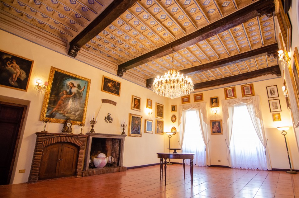 Palazzo Martini è situato nel borgo medievale di Fara in Sabina, incastonato tra i vicoli del centro storico. Un panorama mozzafiato con vista sulla Città Eterna, rende lo scenario unico e suggestivo, famoso sin dal medioevo per essere luogo di relax e villeggiatura per nobili ed ecclesiasti. Quello che oggi appare come una pregiata dimora storica privata è il frutto di vari interventi susseguitisi nei secoli, dovuti ai diversi usi del palazzo nelle varie epoche. Nato come “foresteria” del Convento delle Clarisse Eremite di Fara e legato all’Imperiale Abbazia di Farfa, per ospitare, all’occorrenza, prelati e messi papali, si sviluppa come piccolo convento, con le caratteristiche tipiche, dal grande refettorio, il grazioso chiostro, varie stanze per gli illustri ospiti, nonché spazi dedicati al mantenimento di vettovaglie per la vita conventuale. La nascita della struttura originale si colloca nel XV sec., del quale periodo restano ancora alcuni affreschi nella parte alta del palazzo. Si susseguono interventi voluti al passaggio a dimora privata, circa nel XVIII secolo, dai nuovi proprietari. Tra questi, soffitti a cassettone dipinti, la sala della musica affrescata e probabilmente un diverso uso degli spazi interni. La famiglia Martini, oggi proprietaria della dimora, esegue un restauro conservativo per ripristinare la originale struttura così come era nata. Particolare cura venne riservata al recupero degli affreschi al piano nobile, il restauro dei soffitti a cassettone e il ripristino della facciata in pietra locale. La storica dimora si presenta oggi così come venne ideata senza aver disperso l’originale architettura né stravolto il senso della sua storia.