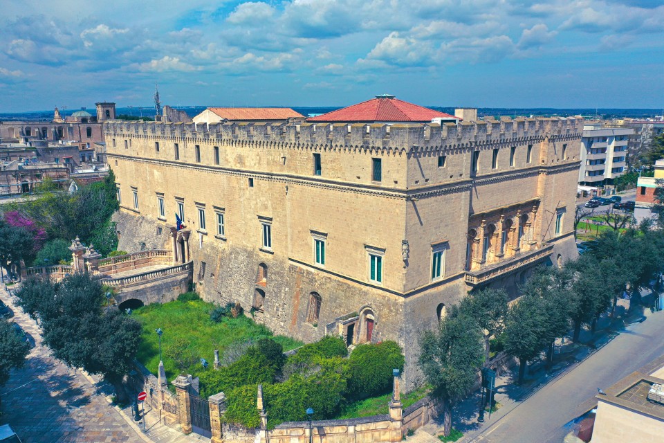 Tra le architetture simbolo di Francavilla Fontana, il Castello-palazzo Imperiali domina con la sua imponenza il centro storico, raccontando secoli di storia, arte e potere. Il primo nucleo risale al XV secolo, quando il principe di Taranto Giovanni Antonio del Balzo Orsini ordinò la costruzione di una rocca a difesa dell’abitato, allora in rapida espansione. A lui seguirono i lavori del marchese di Oria, Giovanni Bernardino Bonifacio, che nel 1547 ne completò l’impianto cinquecentesco. Ma fu solo nel Settecento, sotto i governi illuminati di Michele III e Michele IV Imperiali, che l’edificio assunse l’aspetto nobile di un vero e proprio palazzo signorile. Dopo la morte dell’ultimo principe Michele IV nel 1782, il castello conobbe un periodo di decadenza. Nel 1821 diventò la sede del Municipio, tornando a essere nuovamente il simbolo del governo della città. La struttura, di pianta quadrangolare e sviluppata su tre livelli, conserva elementi della fortezza originaria: il fossato, le murature a scarpata, i beccatelli merlati. Il portale d’ingresso, situato sulla facciata sud, è incorniciato da colonne con capitelli compositi e sormontato da uno stemma con cartiglio, mentre il lato nord presenta una pregevole balconata in ferro. Tra i dettagli più scenografici spicca la balconata orientale con balaustra in pietra e loggia a quattro arcate, decorata con motivi vegetali finemente scolpiti, vero emblema del barocco salentino più colto. L’atrio interno un tempo ospitava la cappella di Santa Maria delle Grazie, voluta da Michele III nel 1722: oggi ne resta traccia nel piccolo campanile a vela e negli affreschi votivi recentemente recuperati. Il cortile quadrangolare è porticato su colonne dorico-toscane e culmina nello scalone monumentale a doppia rampa, forse disegnato da Ferdinando Sanfelice, celebre architetto napoletano. Lungo il ballatoio, tra porte e finestre ornate da eleganti cornici, spicca un’iscrizione latina che celebra il ruolo del principe committente: "MICHAEL IMPERIALIS ANDREAE ET PELINAE FILIUS RESTAURAVIT, AUXIT ET ORNAVIT". Nel salone di rappresentanza si conservano ancora oggi capolavori d’arte e memoria: un maestoso camino seicentesco in pietra leccese, lo stemma della famiglia Imperiali-Spinola, una volta affrescata nel 1929 da Giovanni Vollono, e un’imponente tela settecentesca dell’Ultima Cena, proveniente dal convento degli Scolopi. Infine, le tele raffiguranti Andrea I e Michele III Imperiali, appena restaurate, sono le ultime preziose testimonianze di una corte cosmopolita che fece di Francavilla un centro pulsante di cultura, arte e prestigio internazionale.
